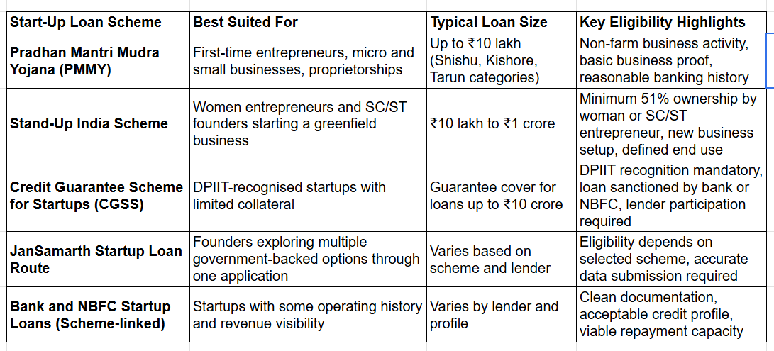 India offers multiple start up loan schemes designed to support new and early-stage businesses. Each scheme targets a specific founder profile, loan size, and business maturity level. Understanding how they differ helps you shortlist the right option instead of applying blindly.